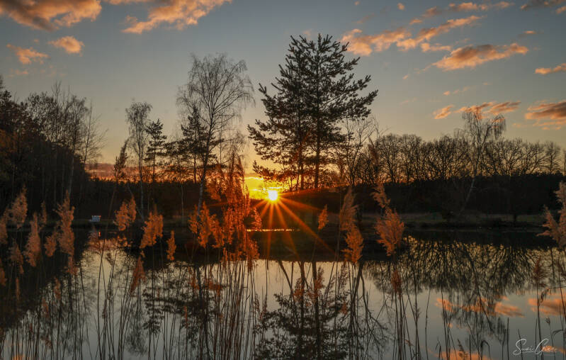 Das Schöne an der Fotografie ist, dass es auch mal für mich anders kommt als geplant. Nach Feierabend wollte ich einfach nur raus, das warme Licht des Sonnenuntergangs genießen. Stress einfach abfallen lassen, die Woche hinter mir lassen. Es sollte ein nahegelegener Weiher sein, den ich mir ausgesucht hatte. Der Sonnenstand hatte sich verändert und es kamen plötzlich Wolken. Für mich war es kein Standpunkt, von dem ich ein schönes Bild machen könnte. Rein ins Auto und ein bisschen gefrustet Richtung Heimat. Nach 500 m ein weiterer kleiner Weiher umringt mit Seegras. Auto geparkt und los. Die Sonne war sehr schnell und ich hatte die Befürchtung, dass mir das Licht zu schnell weggeht. Aber ich hatte Glück. Das Seegras strahlte so schön in der warmen, untergehenden Sonne. Und genau deshalb liebe ich die Fotografie. Überraschend und Beruhigend